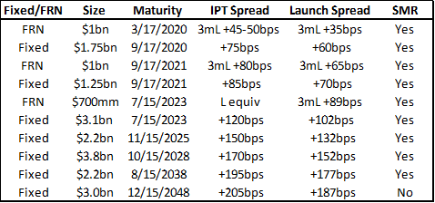 Cigna Corporation (CI) tapped the market this week for $20 billion to fund its acquisition of Express Scripts Holding Co. (ESRX). The deal was the second largest U.S. corporate bond deal this year after CVS’ benchmark deal to help fund its acquisition of Aetna. The 10-part deal was issued out of Halfmoon Parent Inc., which is currently a wholly-owned subsidiary of CI and will be the new ultimate parent of the combined enterprise upon close of the acquisition. Halfmoon is expected to be rated Baa1 (*-)/A- (negative outlook)/BBB (stable outlook). Given the attractive initial price talk (see chart below), the order book grew to over $67 billion. As price talk was tightened, roughly $4 billion in orders dropped.