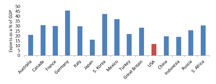 The U.S. economy, while more open today than it has been historically, remains more “closed” than other major economies. By “closed,” economists mean that activity is primarily driven by domestic demand rather than trade. Exports make up far less of the U.S. economy than any other G-20 country (Exhibit 1).