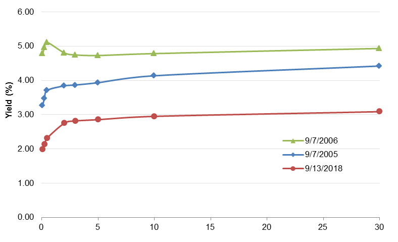The investment environment looks familiar because we’ve been here before. Many times, actually, but most recently in 2004-2006. Thirteen years ago the FOMC was approximately two-thirds through a stair-step hiking cycle. The fed funds rate increased from a trough of 1.00% in June 2004, to a peak of 5.25% in June 2006, in well-telegraphed 25 bp increments. Snapshots of the Treasury yield curve are depicted in the graph below: in September 2005 when the fed funds rate was 3.25%; eight meetings later it was 5.25%; and last week.