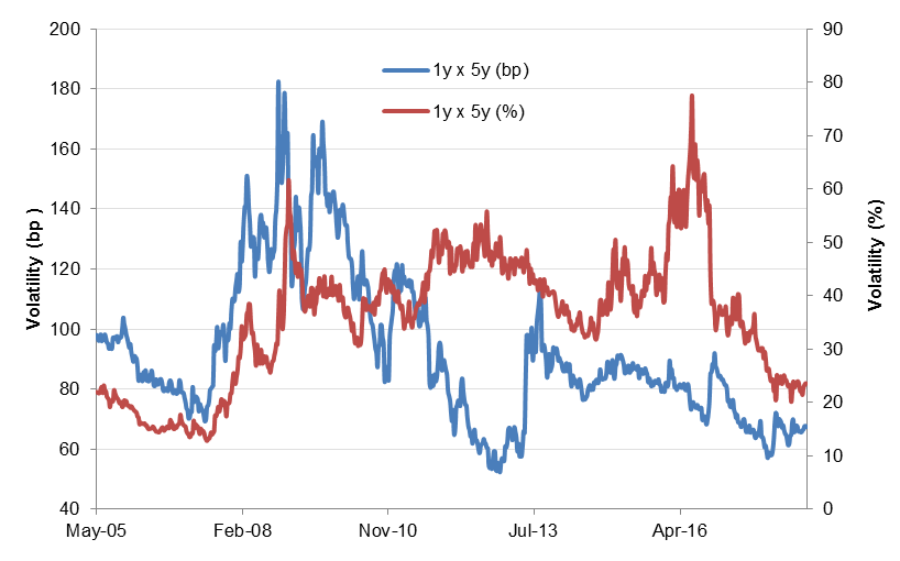 A comparison of historical normalized volatility with Black volatility for the 1-year option on the 5-year tenor (1y x 5y) is shown in Exhibit 3. The red line is Black volatility, and the blue line is normalized volatility (in basis points per year) since May 2005. The predictable 2004-06 hiking cycle and the slowly flattening curve pushed volatility to then-historic lows. On a normalized basis volatility is back to those levels now, and it’s likely that Black volatility will decline further, and the volatility term structure flatten along with the yield curve, as the Fed continues to raise rates.