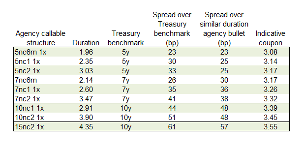 The best pick-up in one-time callables versus similar duration agency bullets is for 7-year and longer maturities with 1-year to 2-year lockouts, as shown in Exhibit 4. The pick-up over matched-maturity agency bullets (not shown) is in the mid to high single digits for most structures.