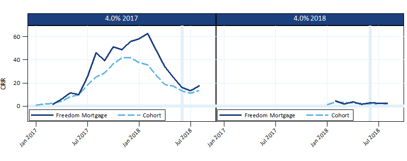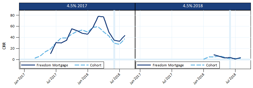 Exhibit 2 (below) shows similar results for 4.5% pools. The 2017 vintage Freedom loans have prepaid only slightly faster than the cohort since May, and the 2018 vintage has been prepaying at cohort levels throughout the year.
