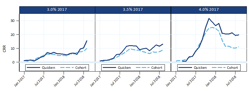 Quicken pool speeds, for all three coupons, widened relative to their respective cohorts. The 3.0% Quicken pools jumped during the summer months, while the cohort showed modest increases. Quicken 3.5% pools have been consistently faster, and also exhibited a summer jump that pushed the gap wider. Quicken 4.0% pools slowed, but not nearly as much as the cohort. Therefore the roughly 5 CPR differential in 2017 widened to roughly 10 CPR in 2018.