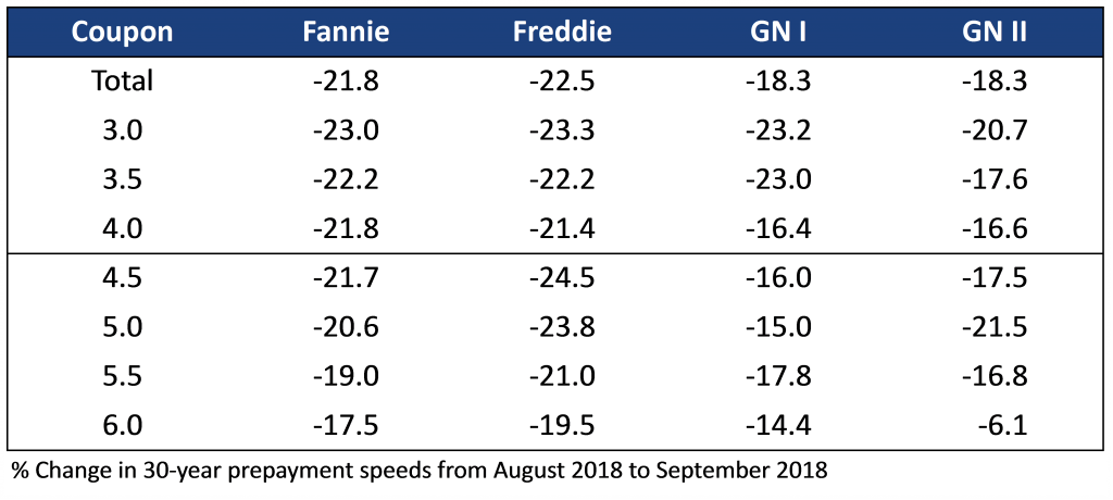 Prepayments in 30-year MBS dropped a sharp 22% in September, landing almost right on expectations. A large drop in business days—four fewer in September than in August–already implied a 17.5% decline. Weaker seasonal housing turnover dragged speeds even lower on lower coupons. October speeds could rebound up to 5% as 3.5 additional business days competes with higher interest rates. Speeds should slow substantially through the fall and winter, possibly getting as low as 5.0–6.0 CPR in January 2019. As speeds cool, concern about extension should heat up, but a couple of corners in MBS offer protection.