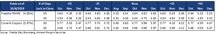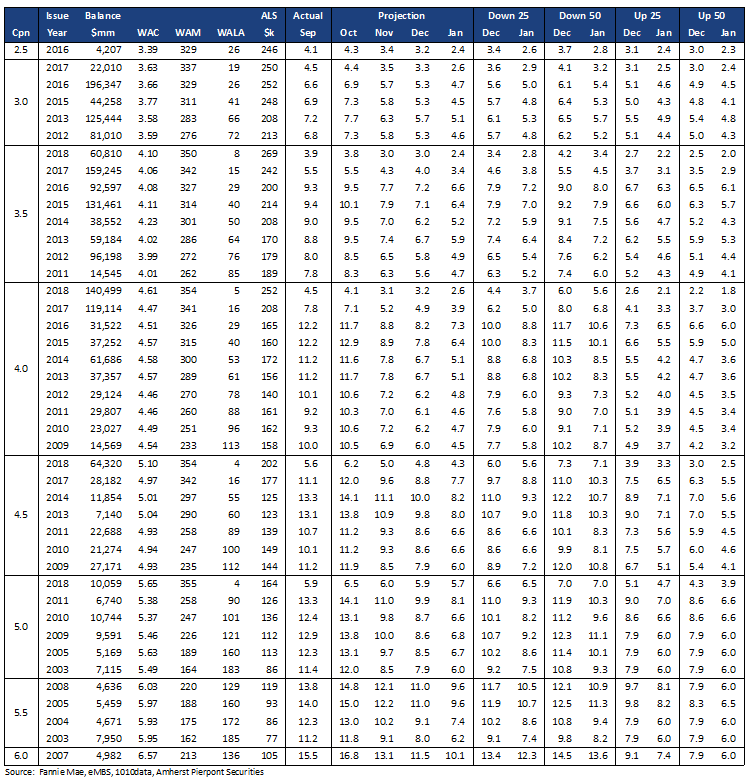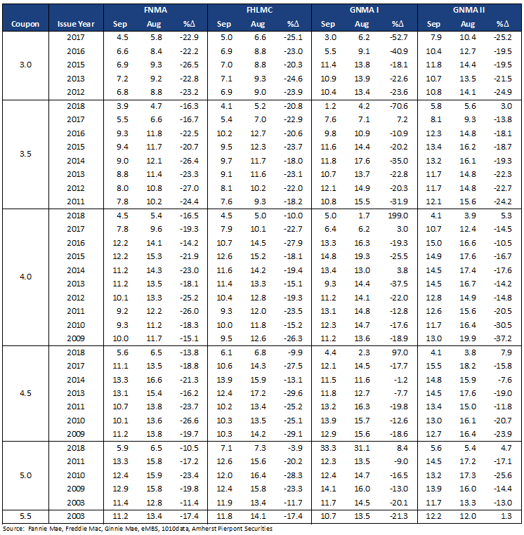 Ginnie Mae speeds slowed a little less than conventionals, with both Ginnie I and II programs slowing 18% overall. The difference was due to much stronger prepayments in the 2018 vintage, which actually prepaid faster in September across the stack. For example, Ginnie II 3.5%s 2018 increased 3.0% to 5.8 CPR while Fannie’s slowed 16.3% to 3.9 CPR.