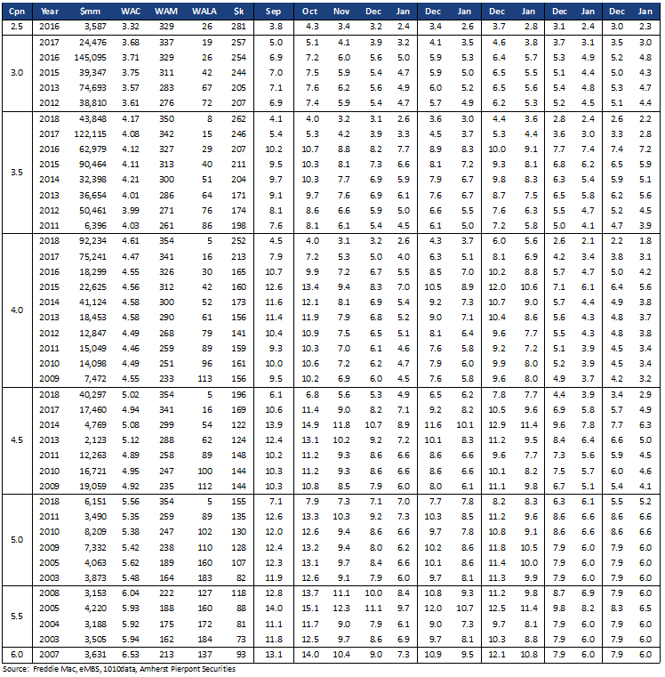 Fannie Mae 30-year aggregate speeds slowed 21.8% to 8.1 CPR from 10.3 CPR, the lowest print since 2008. Premium coupons slowed a bit less, since these loans are less sensitive to seasonal changes in housing turnover. Newer 2017 and 2018 vintage cohorts tended to slow less than more seasoned cohorts.