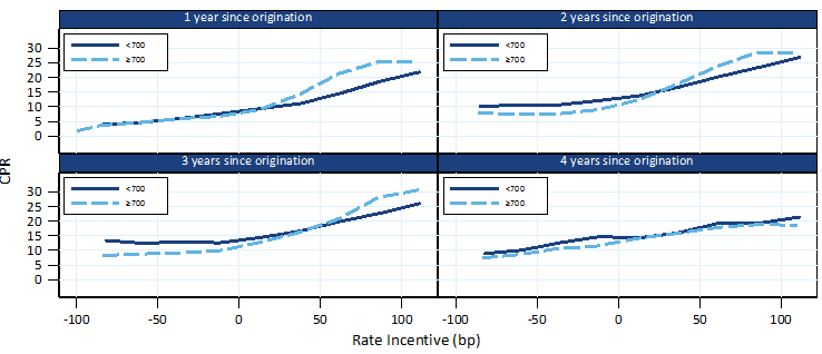 In the first year low FICO loans clearly prepay slower when in-the-money. The GSEs charge a very high upfront loan-level price adjuster (“LLPA”) for low FICO loans. For example, a borrower with a 670 FICO score taking out an 80 LTV loan has to pay 2.75 points (in addition to any other LLPAs that apply). Using a 5x multiple implies a 55 basis point reduction in rate incentive. This elbow shift make the S-Curve look flatter.