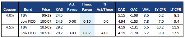 The 4.5%s are trading at roughly 40% of theoretical value, suggesting they are inexpensive. The 4.0%s are even more interesting, since the theoretical payup is higher than on 4.5%s. This suggests that much of the value from these pools comes from the extension protection. Meanwhile the market payup is actually lower on 4.0%s, making them an especially good value if rates continue to move higher.