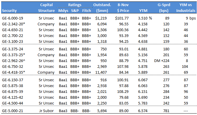 GE needs no introduction and yet as a corporate bond issuer raises so many questions. This one-time AAA corporate bond issuer now faces high-BBB ratings from all three rating agencies following what could only be categorized as a shockingly-high goodwill impairment charge in 3Q18.  The wide range of opinions have resulted in a volatile spread movement in recent weeks, leaving more questions around the company’s future, and as we go to press, the stock is in a near free-fall on negative equity views from the Street.