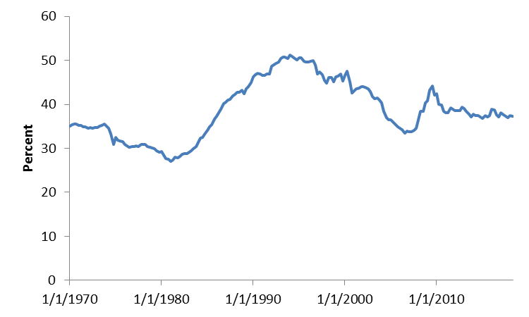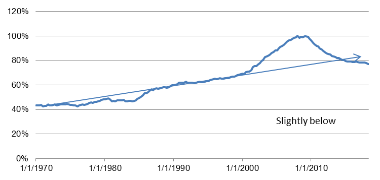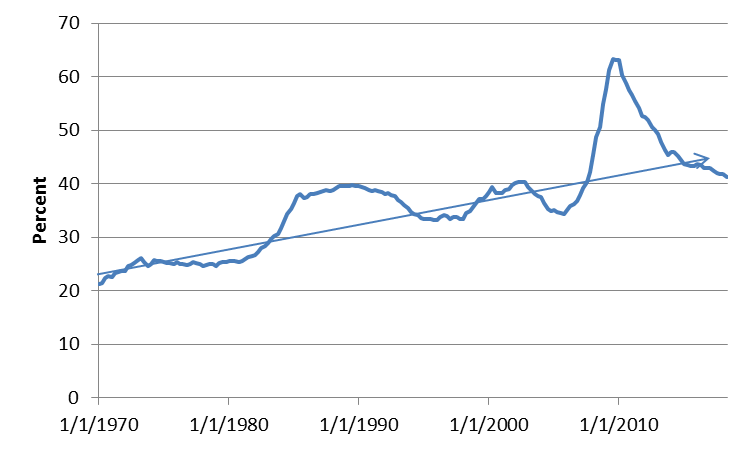 The fall in household debt relative to GDP has brought the ratio down to 77% as of mid-2018, the lowest reading since 2002 and almost entirely unwinding the steep run-up in the ratio during the mortgage boom years of the early-to-mid 2000s. This series exhibited a significant uptrend trend, even before the unsustainable borrowing seen in the 2000s, as households have come to use credit for more and more of their spending, including many types of routine day-to-day transactions that would never have been purchased on credit decades ago. As a result, the drop in the debt-to-GDP ratio over the last decade has brought the latest levels modestly below a trend line fitted to the uptrend seen in the 1970s, 1980s, and 1990s.