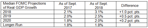 The popular view is that the sharp acceleration in real GDP growth in 2018 was mostly a “sugar high,” brought on by fiscal stimulus. This view is largely shared by the FOMC, as shown by the evolution of growth projections since the passage of tax reform nearly a year ago (see Exhibit 1).