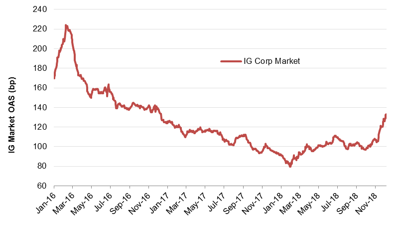 Source: Bloomberg; US dollar investment grade all cash bonds sector option-adjusted spread index.