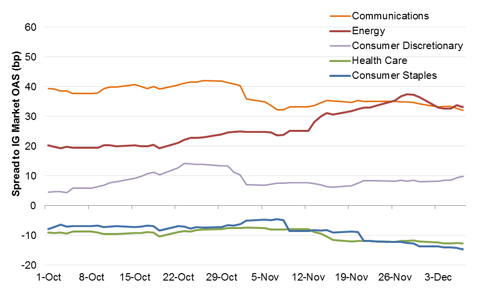 Consumer discretionary has an OAS slightly wider than the broader market but typically has a beta below 1.0. This was perhaps the worst performing sector as it widened 41 bp over the period, more than overall market, and was wider in late October during the depths of the sell-off in some automakers which dragged out the sector. The reverse occurred in communications – a traditionally higher beta name which actually outperformed during the overall sell-off, widening only 30 bp.