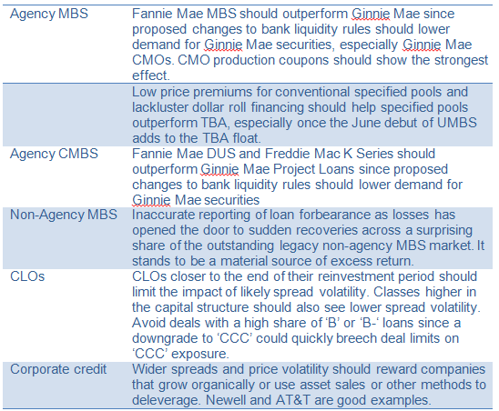 Credit spreads should continue widening until they have priced fully for decelerating growth next. Slower growth poses risk to the nearly $3 trillion in ‘BBB’ credit, especially the most highly leveraged names. Names that show organic growth or use free cash flow or asset sales to pay down debt should perform the best. Wider spreads in corporate credit should put pressure on other spread assets, although consumer debt should show less volatility. Agency MBS, which also will need to adjust to likely falling bank appetite, should widen, too.