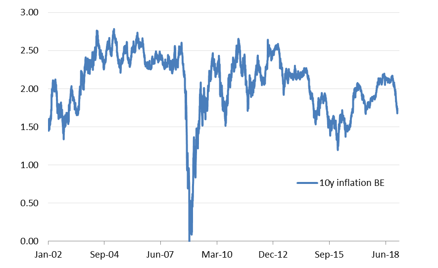 Exhibit 2: Ten-year inflation breakevens have dropped sharply