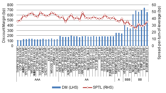 The market seems to demand surprisingly consistent spread-per-turn-of-leverage, or SPTL, in CLO classes over time (Measuring relative value through spread-per-turn-of-leverage), but it also seems to demand consistent spread across different offerings at a given point in time. A given day’s offerings across and within CLO rating categories can show a wide nominal range but a limited range of spread-per-turn-of-leverage. At least 47 CLO debt classes from ‘AAA’ to ‘BB’ showed up in the market on January 15, for instance, with indicated nominal discount margins ranging from 111 bp to 744 bp. But SPTL across these offerings only ranged from 26 bp to 49 bp.