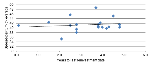 The tendency for SPTL to explain a large part of the range in nominal spread across and within rating categories immediately raises the possibility that it evens the playing field for finding relative value across CLO debt. Before drawing that conclusion, however, it’s worth seeing if some of the differences in SPTL reflect other features of a CLO offering—like time-to-first-call-date and time-to-last-reinvestment-date.