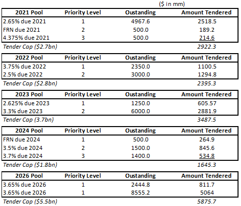 Anheuser-Busch Inbev released the early results of their $16.5 billion tender offer. In total, $16.3 billion bonds were put in for tender by the early tender expiration. The pricing for the total consideration of the bonds occurred on 1/25/19. Immediately following the pricing, ABIBB announced that they reallocated some of the pool caps so that the amount of each series accepted for purchase was equal to the amount tendered. The tender offer was roughly $200 million shy of the total goal.