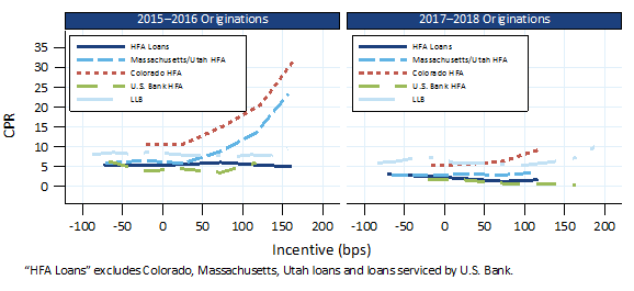 In general the HFA loans have a flatter and slower S-curve than LLB loans, even though the HFA loans can be much larger; the average original HFA loan size is roughly $150,000 and the largest loans can approach $400,000. They offer substantial prepayment protection in a rally, but will prepay slower in a high rate environment. The second lien discourages the borrower from moving since the borrower would need to repay it. Most borrowers will choose to wait until after the lien is forgiven, but, after forgiveness, show more willingness to move. This is evident in the chart, which shows a smaller gap between HFA and LLB speeds for the 2015 and 2016 loans than for the newer 2017 and 2017 vintage loans.