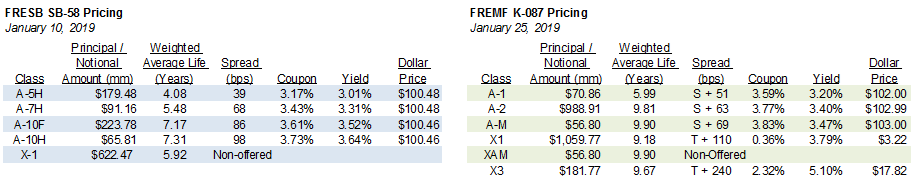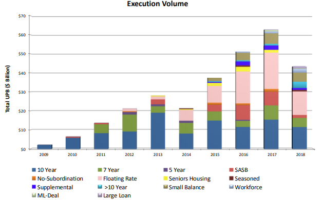 The Freddie Mac Small Balance Loan program has undergone some structural changes over the past year in response to investor feedback: the number of deals in 2018 was one per month, down from frequently two per month in 2017, and the average deal size grew to $535 million from $290 million. The reduced deal frequency has benefited smaller investors who often lack the bandwidth to conduct deep dive analysis of the collateral on a bi-weekly basis. The larger deal size has started to attract the institutional investors who need better liquidity and buy in significant size. The multifamily small balance loan program is expected to continue growing in 2019. The January deal was $622 million, and the monthly deals may reach $750 million in size. The additional liquidity may ultimately tighten spreads, while the additional yield over K-FRED deals and shorter average weighted lives of the FRESB securities continues to attract new investors.