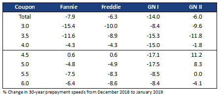 Slower speeds were driven by low seasonal housing turnover, which is usually very low in January. Speeds fell despite 2.5 additional business days and 25 bp to 30 bp lower lagged mortgage rates. Low coupon pools, which primarily prepay due to housing turnover since the loans are out-of-the-money to refi, slowed the most. For example, Fannie Mae 3.0%s slowed 15.4% in aggregate, and most vintages of that coupon slowed comparably.