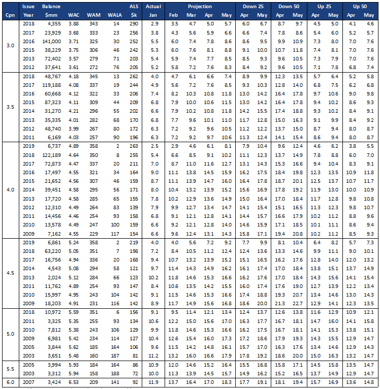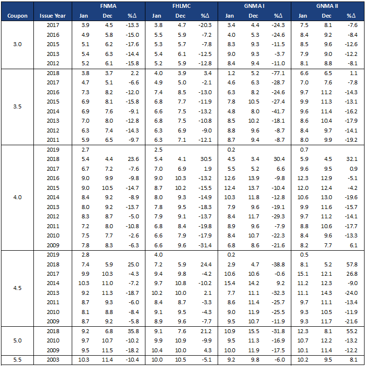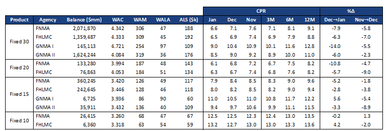Similar to December, discount Ginnie Mae pools did not slow as much as conventional pools and remained generally 2 CPR to 3 CPR faster than conventionals. For example: