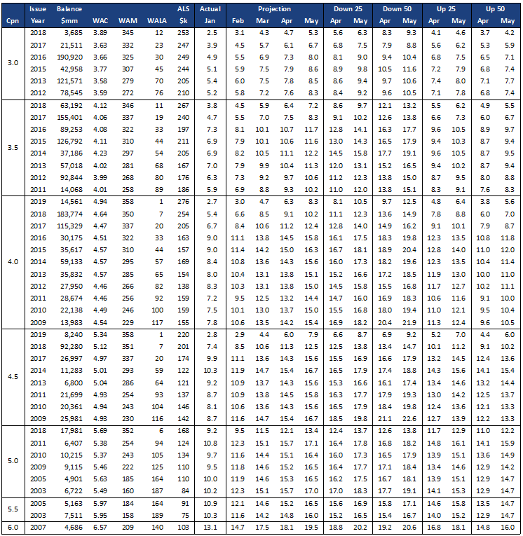 Fannie Mae 30-year aggregate speeds slowed 7.9% to 6.6 CPR from 7.1 CPR, somewhat more than the expected 5% slowdown. Freddie Mac 30-year speeds fell 6.3% to 6.5 CPR from 6.9 CPR, a bit closer to expectations than Fannie’s print. Gold speeds were a little stronger in 3.0%s and 3.5%s