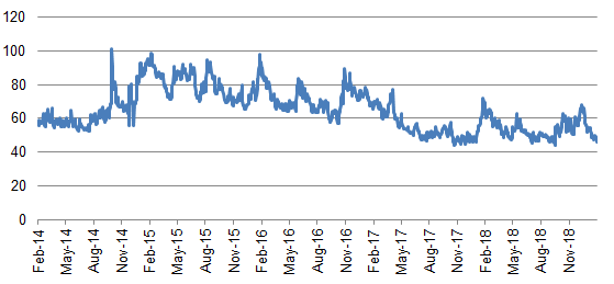 The MOVE index of interest rate options across the yield curve has dropped 17 points since the beginning of January and hovers just above recent record lows (Exhibit 1). Problems with US-China trade negotiations or Brexit could push volatility up. But if both of those play out in an orderly way, implied volatility this year could set a new record low.