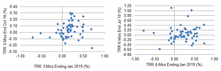 Manager performance over the most recent 3- and 6-month periods has varied significantly from one period to the next. Performance in the 3-month period ending in January was positively correlated with 3-month performance ending in October, but only modestly (Exhibit 2A). Performance in the 6-month period ending in January was positively correlated with 6-month performance ending in July, but again only modestly (Exhibit 2B).