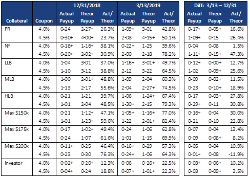 - 100% investment property pools—These loans face very high LLPAs, which elbow shifts the S-Curve towards slower speeds. The S-Curve also tends to be somewhat flatter than generic collateral. The pay-ups are typically very low for these loans, and while they moved relatively higher, both 4.0% and 4.5% pools are still trading at only 22% of theoretical value.