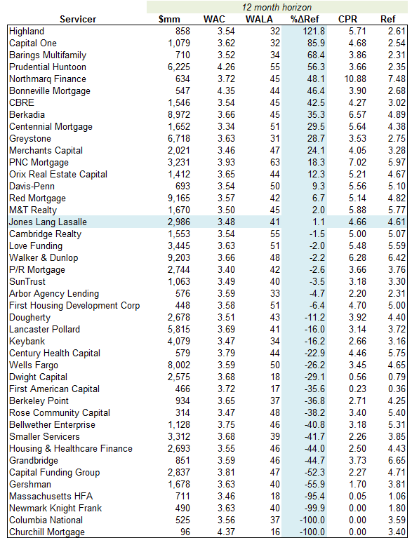 The column highlighted in blue indicates that the servicers are sorted from those with the highest speeds on a percentage basis relative to the underlying reference cohort, to those servicers who have the slowest speeds. The highlighted row, which in this instance corresponds to the servicer Jones Lang LaSalle, identifies the servicer whose historical prepay speeds are currently closest to those of the universe.