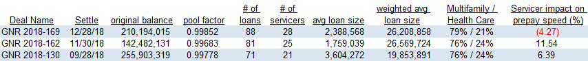 The same analysis was applied to the other two deals: the GNR 2018-169 deal would be expected to prepay 4.3% slower than a reference cohort, and the GNR 2018-130 falls between the other two at 6.4% faster potential prepayment speeds.