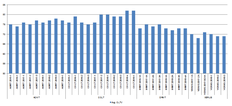 Unfortunately, underwriting and documentation across shelves with the most alternative documentation are not uniform and as such it makes it somewhat challenging to make truly equivalent comparison of risks in limited or alternative documentation loans. Simply looking at 2018 issuance would suggest that limited and alternative documentation loans in Invictus’ VERUS program may be the least risky given an average 720 FICO and 67 original CLTV. Slightly better than Deephaven’s limited documentation loans that had an average 712 FICO and 72 origial CLTV. Non-full doc loans in the COLT and Angel Oak programs had average FICOs of 709 and 705 and original CLTVs of 78 and 79 respectively.