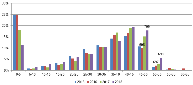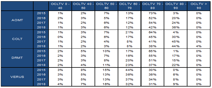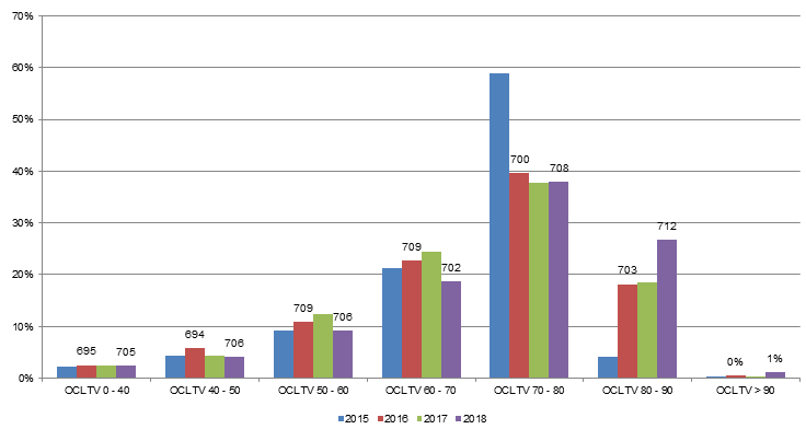 • Loans between 45 to 50 DTI made up an additional 8% of 2018 collateral, but average FICO scores jumped by 13 points from 696 to 709.