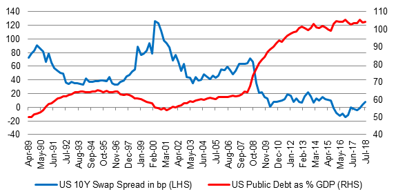 Exhibit 1: Treasury debt as a share of GDP has shaped spread markets