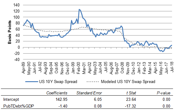 Exhibit 2: A swap spread model with only Treasury supply captures broad trends