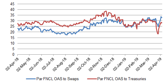 Exhibit 3: With US deficits clearer since early 2018, MBS has held spread better against Treasury than the swaps curve