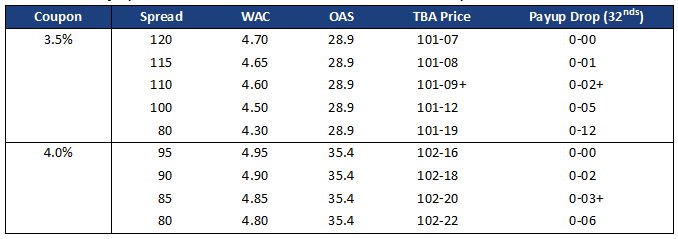 Payups were estimated by running 3.5% and 4.0% January Fannie major pools on March 27, the recent low in rates. The January pools had very high gross WACs. The prepayment model’s elbow was then dialed to simulate the effect of a falling gross WAC; valuations were run at constant OAS to the TBA.