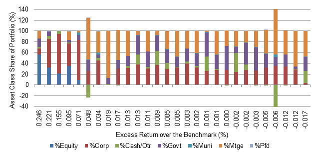 The road to alpha took different routes, but the five funds with the highest alpha also had the highest allocation to equity and corporate debt (Exhibit 2). Equity might not seem obvious for a fund benchmarked primarily to a bond index, but investment guidelines can offer broad flexibility. The generally lower correlation of equity to fixed income creates a more diversified portfolio and often helps lift excess return against a fixed income benchmark. Of the funds with no equity, higher alpha was slightly correlated—but only slightly—with going overweight corporates, mortgages or preferred debt and underweight Treasury debt. That means some portfolios swung for the fences in these assets and ended up negative.