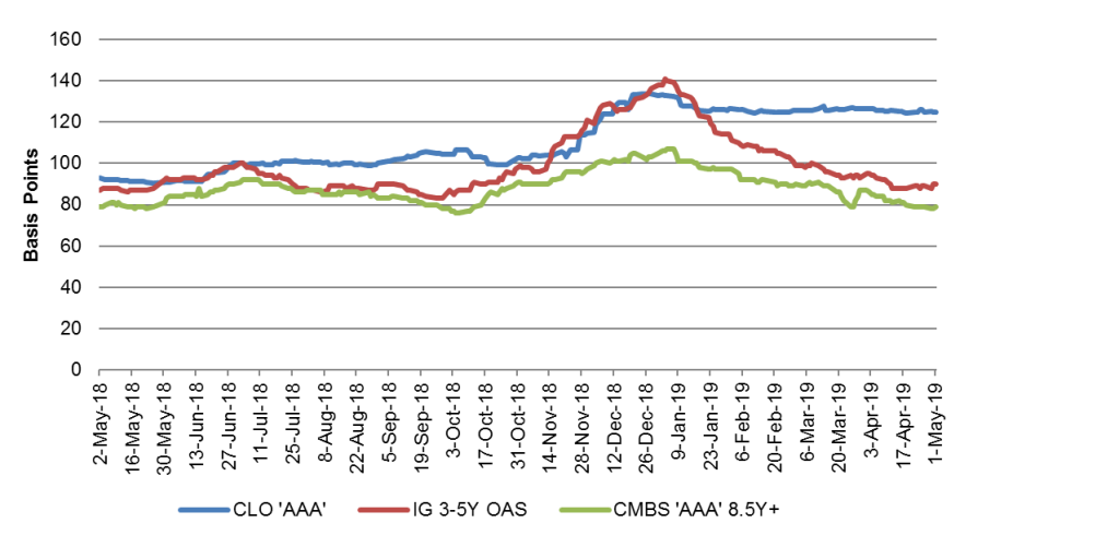 Since the beginning of the year, benchmark CLO ‘AAA’ spreads have tightened 8 bp with other parts of US fixed income much tighter. Spreads on 3- to 5-year investment grade corporate debt, for instance, have tightened 48 bp, and spreads on CMBS ‘AAA’ have tightened 26 bp (Exhibit 1).