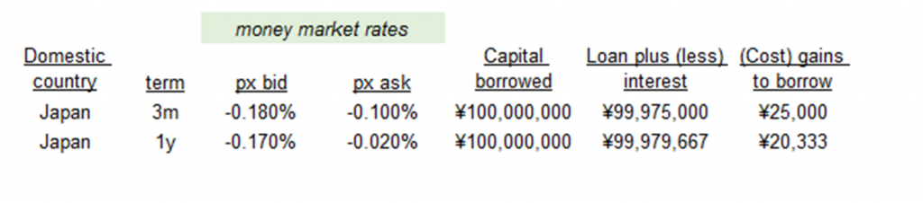 Money market rates in Japan are currently negative, meaning investors can borrow 100 million yen, for example, and repay 99.975 million yen three months from now (Exhibit 2). The 25,000 yen difference is a gain on the loan that will be added to the projected profits from the investment.