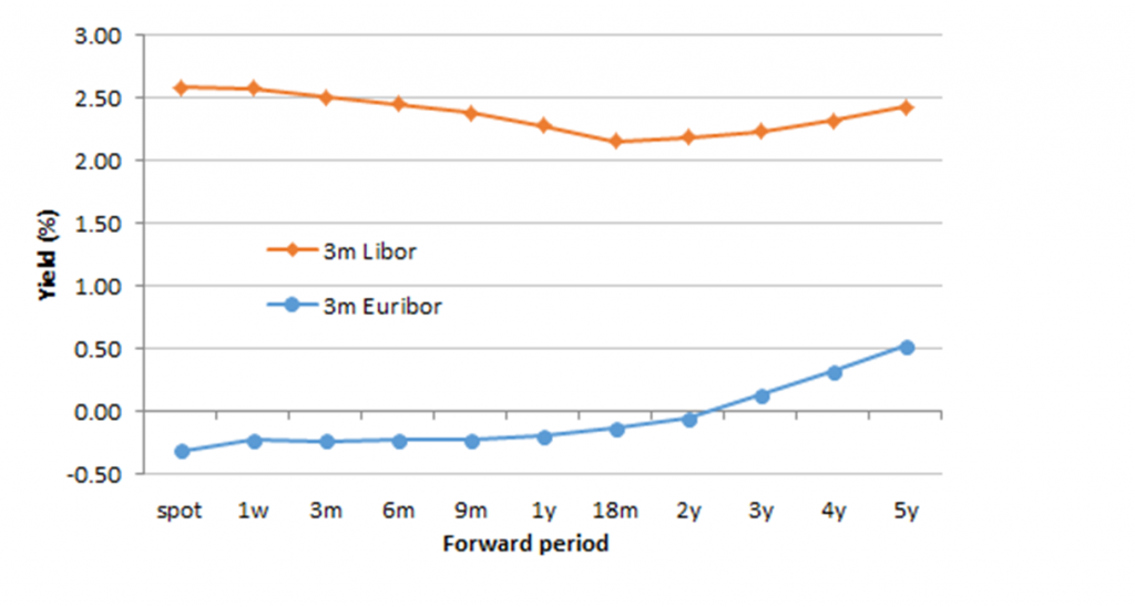 Exhibit 5: Projected forward 3-month LIBOR and EURIBOR rates