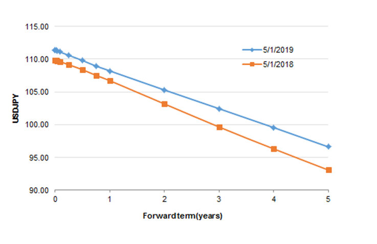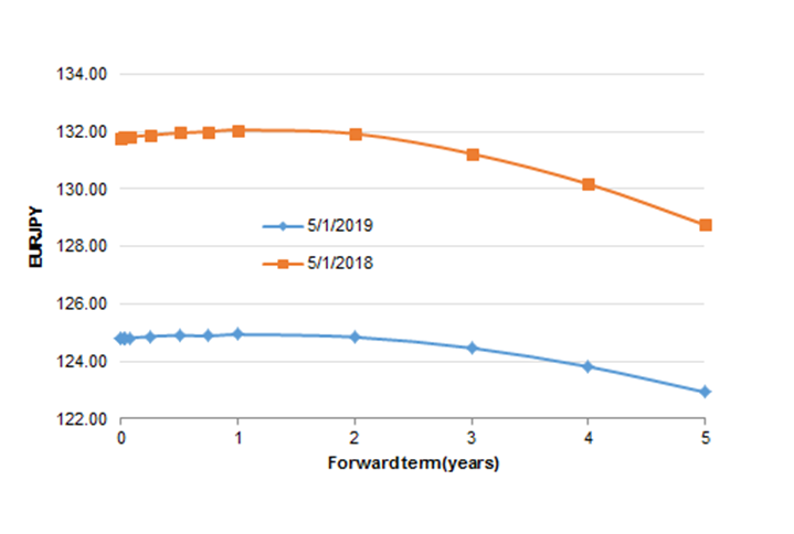 For the year ending on May 1, the US dollar appreciated 1.4% to the yen while the EUR depreciated 5.3%. The depreciation of the EUR versus the yen helps the projected return analysis for new investments because (1) new capital in yen is worth more euro and (2) the shape of the forward exchange rate curve stayed the same, which prices in a much slower appreciation of the yen versus the EUR than it does versus the USD.