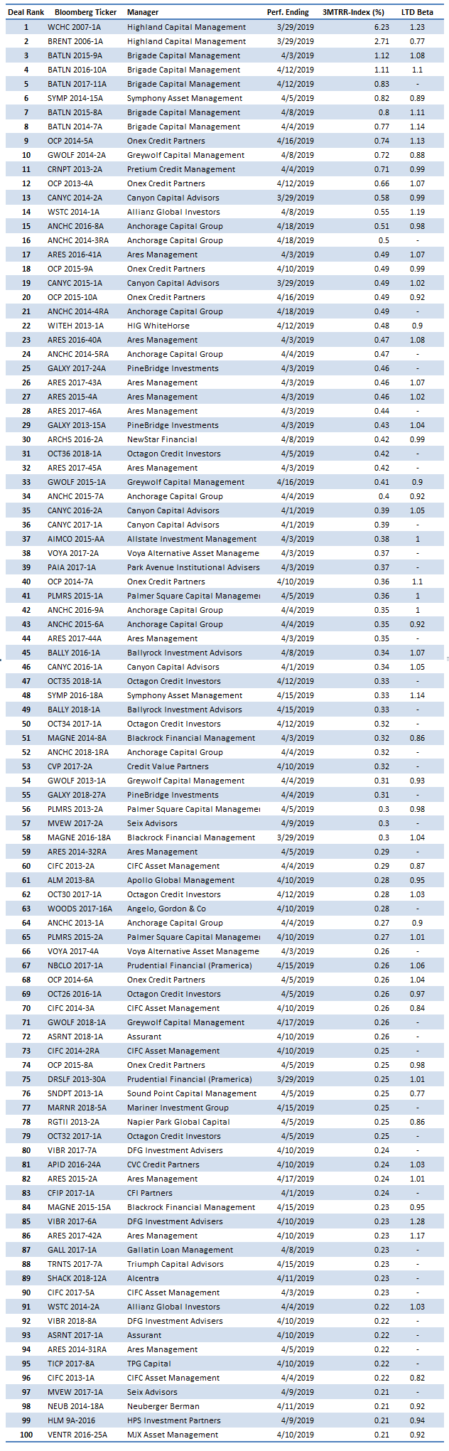 Cumulative 3-month returns through April in the APS CLO Total Return Top 100 ranged from 6.23% to 0.21% above the index (Exhibit 1). Returns in 595 portfolios below the Top 100 ranged from 0.20% above the index to 4.34% below.