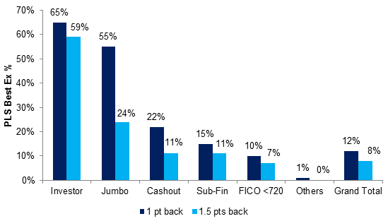 Estimating the percentage of GSE loans with a better potential private takeout requires a series of assumptions, the most critical one being the spread at which the senior pass-through trades behind its TBA benchmark. The flow of GSE loans into private MBS will ultimately be highly levered to this spread. Assuming a senior pass-through pricing $1-00 back would push 12% of loans sold to the GSEs in February into private MBS. Widening that spread to $1-16 back of TBA would reduce the flow of GSE loans into PLS to 8%. Different types of loans will be more levered to changes in the price of the ‘AAA’ pass-through than others. Loans with more margin in private execution, like investor loans, are less levered to changes in pass-through spreads while loans with thinner margins are more so.