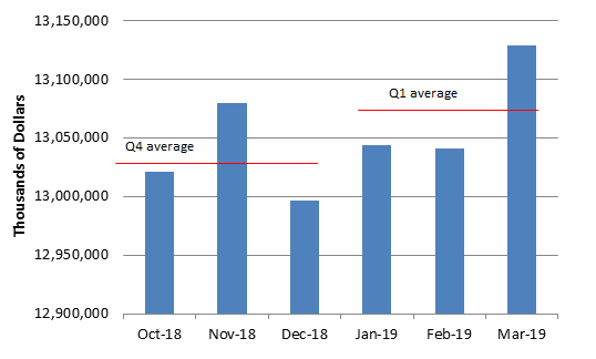 More realistically, if spending in April, May, and June each grow by, say, 0.2% per month, the Q2 average would work out to a 3.4% annualized increase. My very preliminary forecast for Q2 is slightly more optimistic, assuming monthly increases of 0.25% per month, a 3% annualized clip, not much different than the 2017 and 2018 performances (2.7% and 2.6% respectively), and produces a quarterly annualized advance of 3.8%.