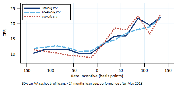 Comparing S-curves for VA cash-out refinances by original LTV, the S-curves for loans with original LTV greater than 90% do appear to be a little steeper, but the difference is fairly small (Exhibit 5).