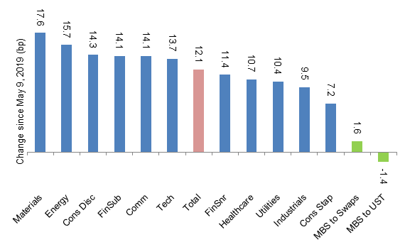 Exhibit 1: Wider spreads on corporate debt since May 9, limited change in MBS