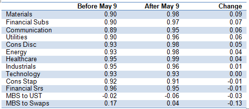 Note: Before May 9 covers 60 sessions, after May 9 covers 21 sessions. Correlations are between daily spread changes in each sector and daily changes in the Bloomberg All Cash Bonds OAS. Source: Bloomberg, Amherst Pierpont Securities