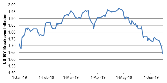 Implied 10-year inflation has dropped from 195 bp at the start of May to 165 bp lately (Exhibit 1). Core PCE has steadily dropped since December, so recent readings seem an unlikely immediate cause. New US tariffs on China announced May 9 arguably should have an inflationary effect, so it is hard to see cause there either.